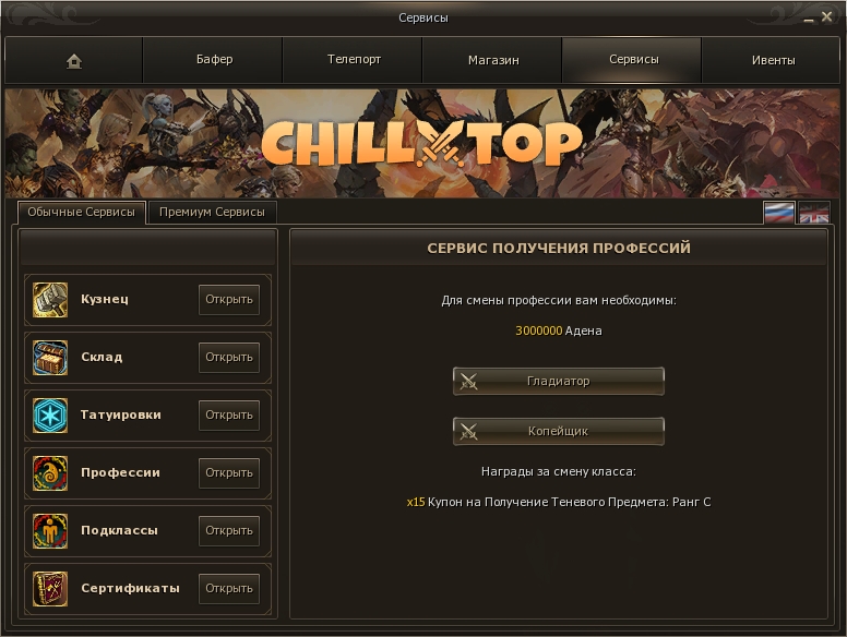 Взять новую профессию или сабкласс можно в Alt + b Сервисы.